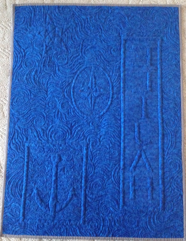 I wish I had put more points in the compass and done the star differently. The anchor still seems to “thick” to me. The frames around the name and anchor are 3/4″ wide. I think I would have preferred a half inch frame. I am really happy with the background quilting. I really like it around the anchor. I used white Glide thread and never had a single tension or breakage issue. Love that stuff!