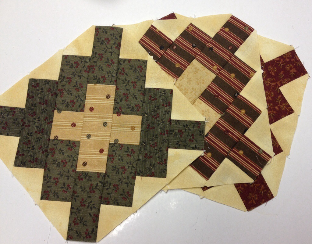 Hey! When I was at Homestead Hearth last week, I purchased a yard of that fabric in the center of the left-most block at top! And I think I have some scraps of the green in that block, too. LOVE those fabrics! Yum!