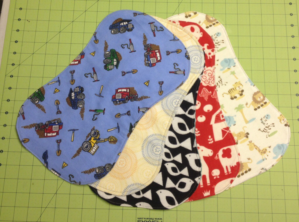 Next I cut the burp cloth out with pinking shears about a quarter inch beyond the seam and turned it right side out. I finished them off by topstitiching close to the edge.