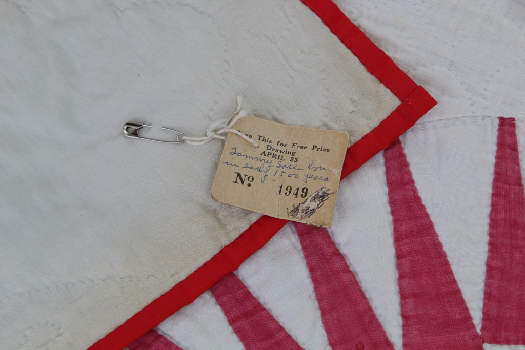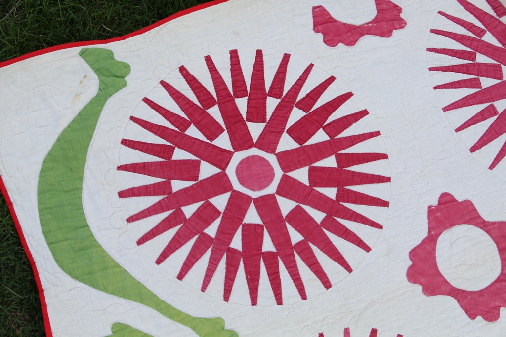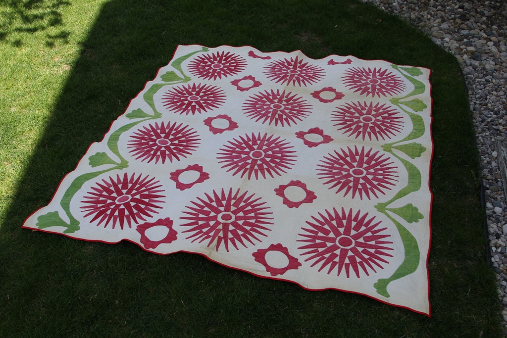 As you can see, it is quite worn and there are some stains. The binding has been replace with a rather garish red. The tag reads: “Tammy Sarle born in early 1800 years.” The reverse side reads: “This quilt made my Tammy or Tamia Vosberg Sarles, 100 years old.” the tag is dated 1936. Images courtesy of Daughter #3, an amazing photographer!