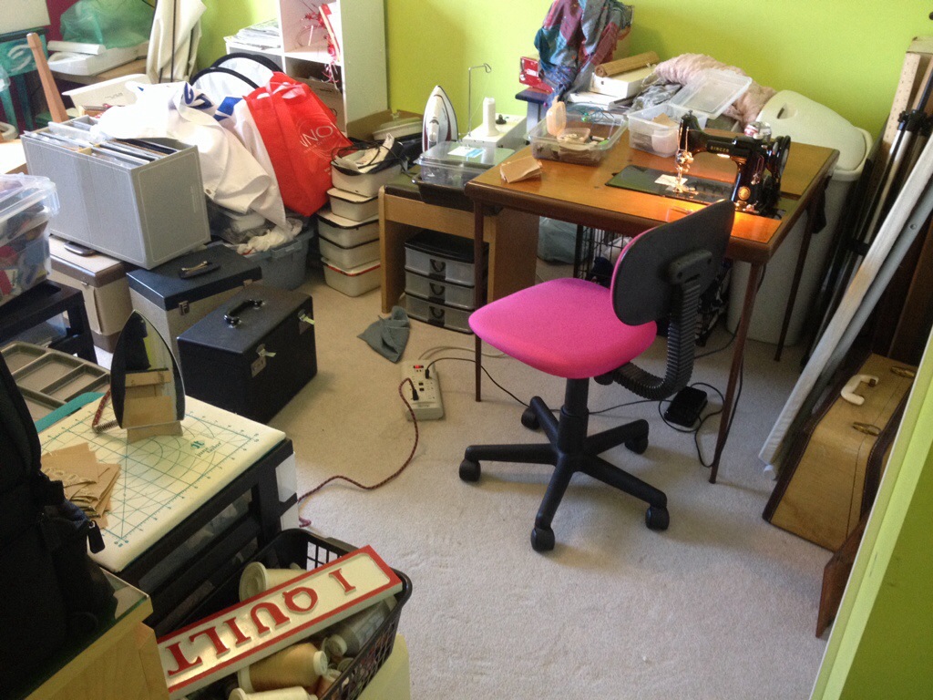 I am so pleased to see a sewing room that looks somewhat like mine!! I have piles of stuff and bags of stuff all over too! Shelves of stuff too! A space big enough to swivel from machine to iron and your done! Great. thanks so much for sharing – whenever I see all the beautiful sewing rooms with floor space and fabric all stored in beautiful stacks in tidy cabinets etc it makes me feel really bad – so seeing yours has made me feel great!!