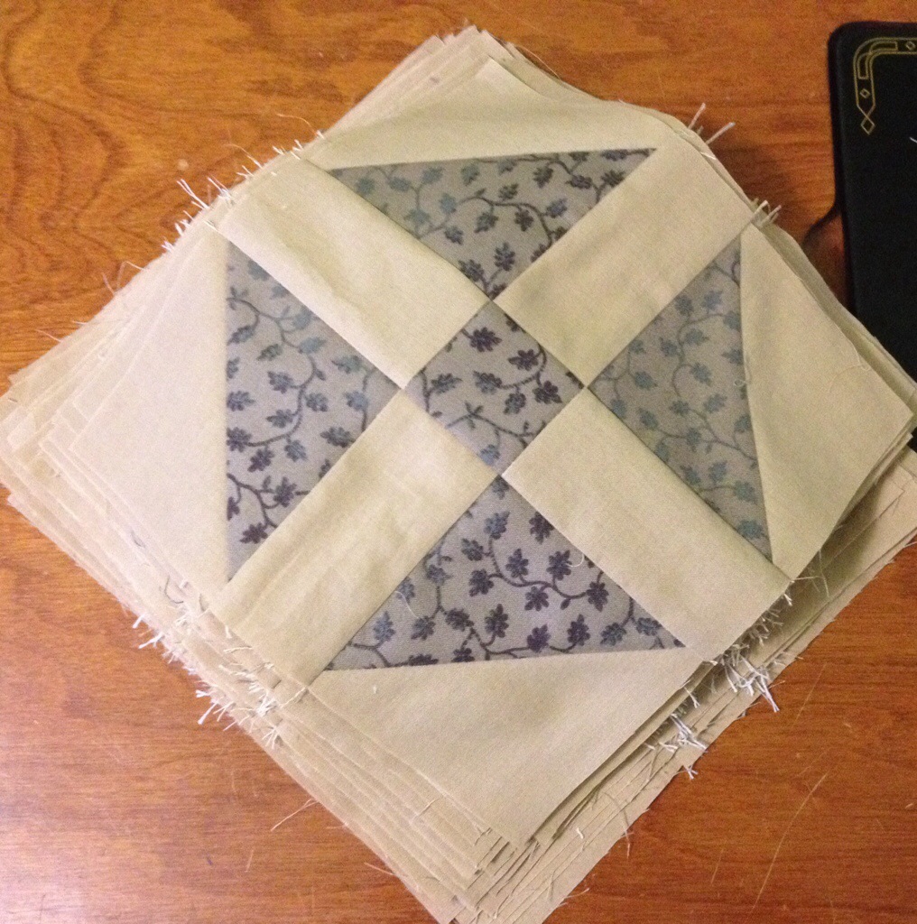 I have a container of 2 1/2″ squares that I am using to make these. I may just go ahead and empty the bin making more. What I work on these days is dictated by what I can find in the aftermath of the flood! I am very glad I was able to find a few containers of pre-cut pieces.