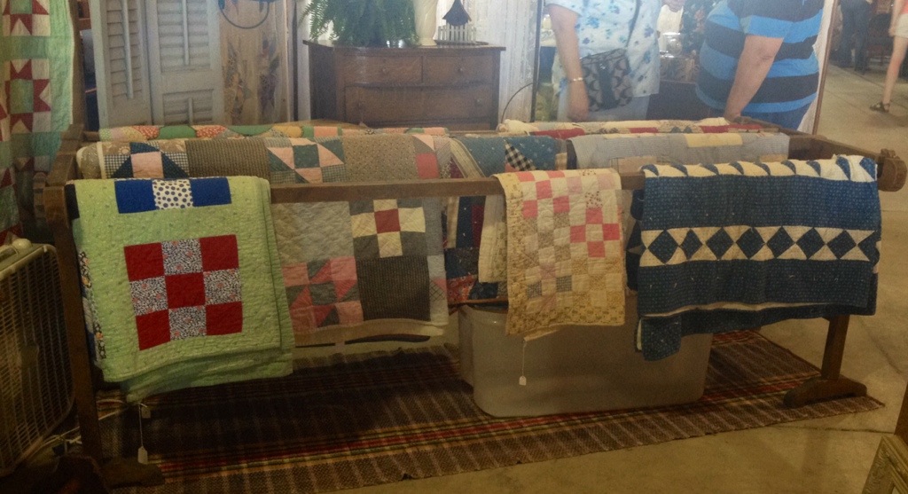 Yesterday, we took a break from the basement and went to the local antique fest. I saw this wonderful old quilt frame just covered with quilts.