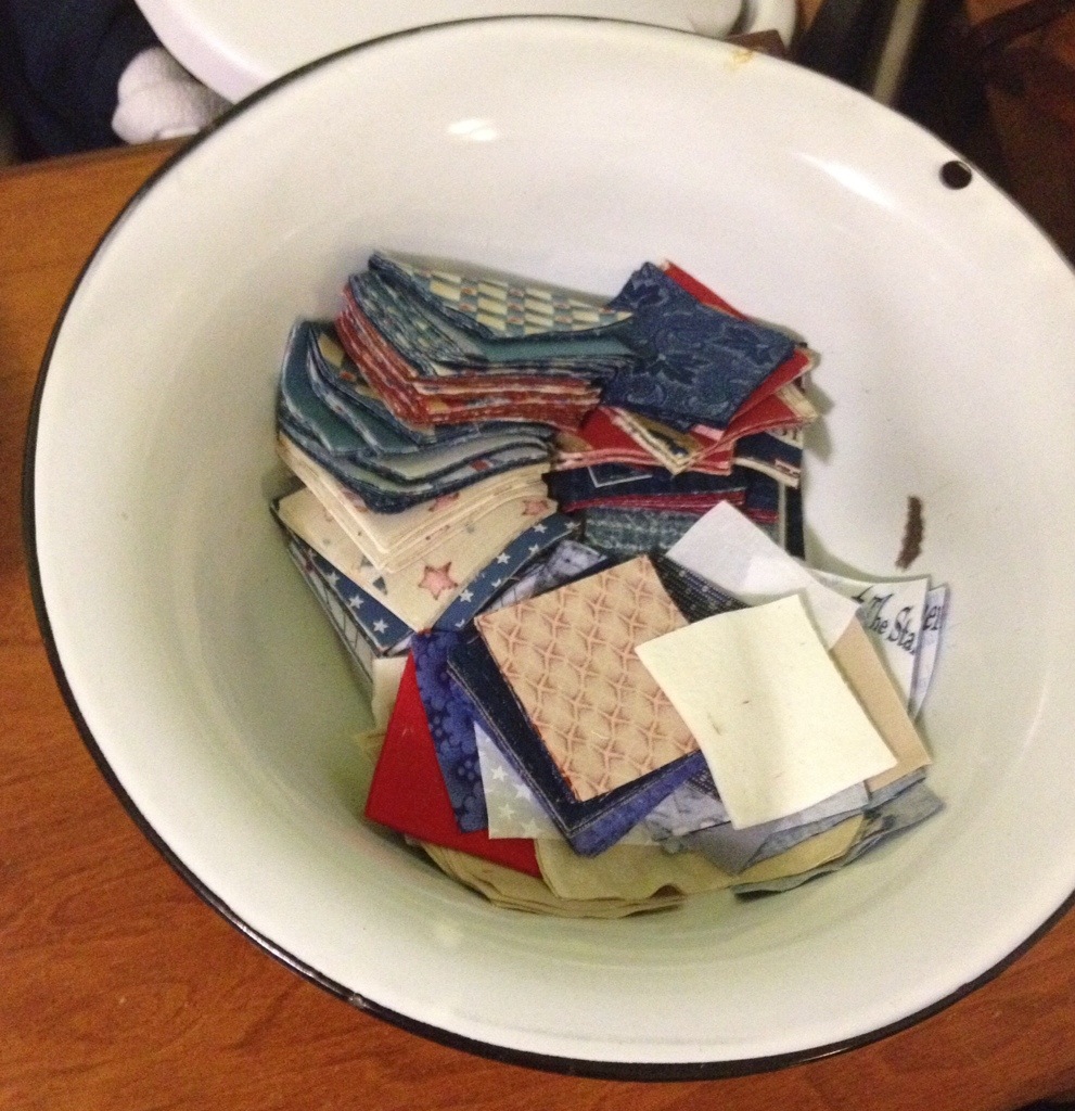 I also found a few containers of red, white, and blue scraps and chopped them into 2.5″ squares to make more 4 patches.