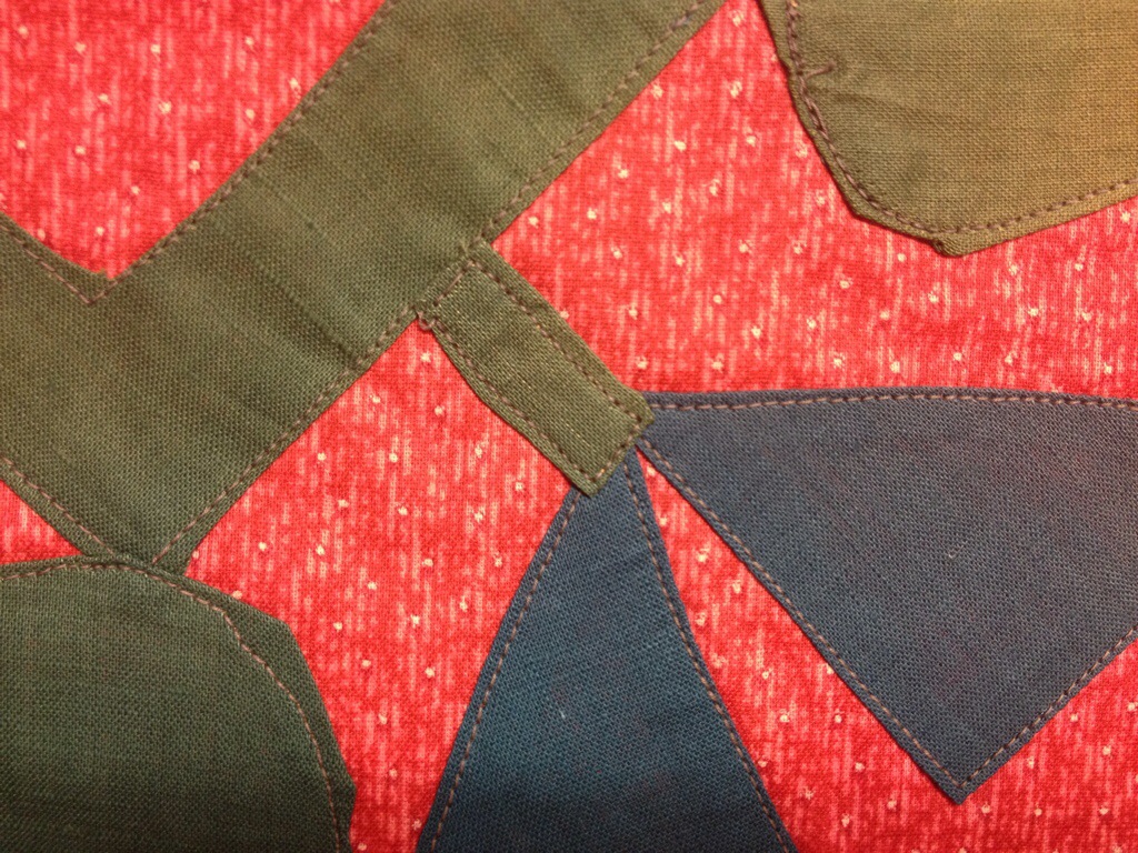 At one time, the appliqué was probably all one shade of green. This has been top stitched down by machine. A radical move at the time this block was made! It is not even close to being actually square. I love the wonkiness and daring of this block. I would love to finish it somehow. It is quite large, nearly 17″ square.