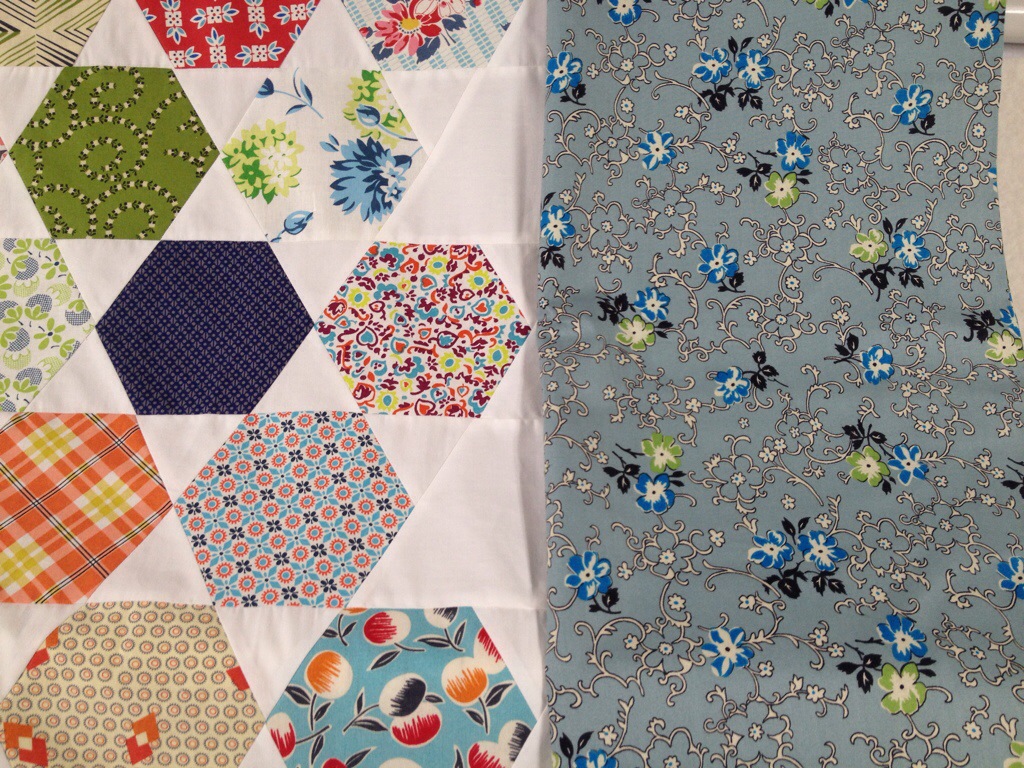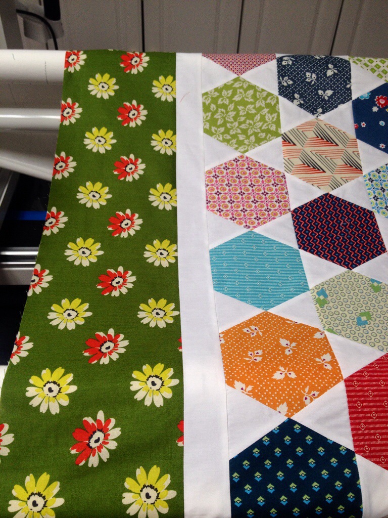 The quilting looks great on your friend’s quilt. Personally I quite liked the green border as I think it ‘brightens’ the centre. The navy seems to flatten the colours. Maybe a smaller print? Hexagons look great.