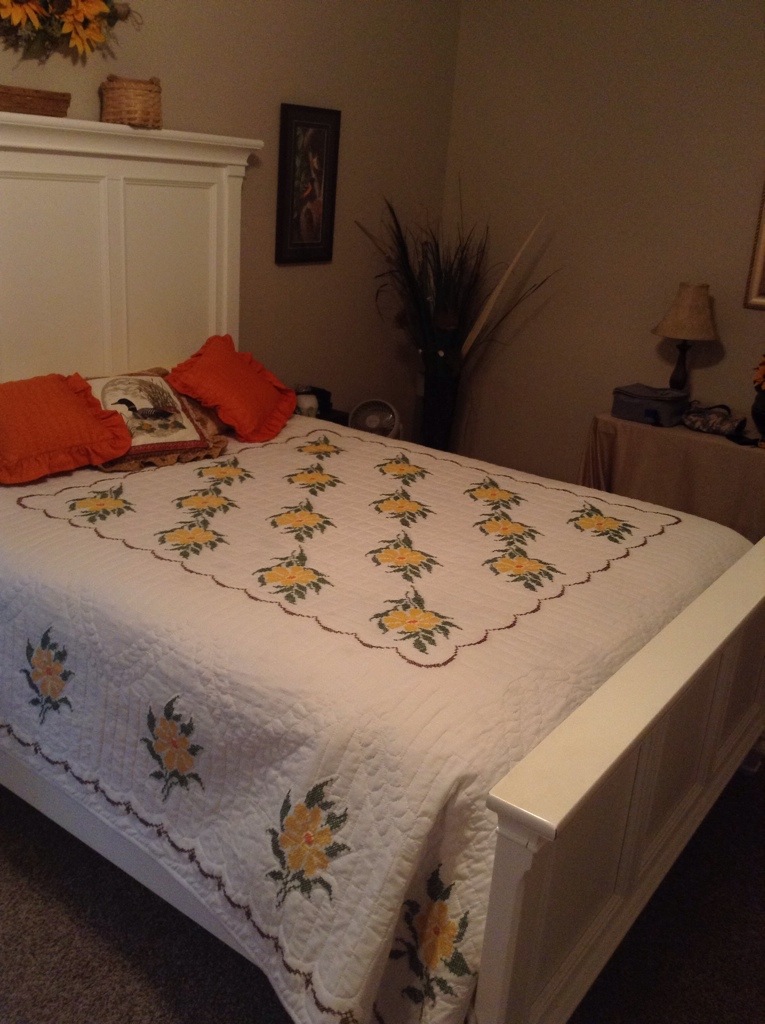 She helped me quilt my second quilt. I had basted it and bought an extra hoop to hand quilt it. She worked on one end and I worked at the other. It was the first time for her to quilt in a hoop and she let me know this was some newfangled system! She also told me my size 7 needles were like quilting with nails. But she never mentioned how ugly that quilt was nor how poorly pieced. I used her quilt frame for many, many quilts until I switched to machine quilting. Here is one of her later quilts: