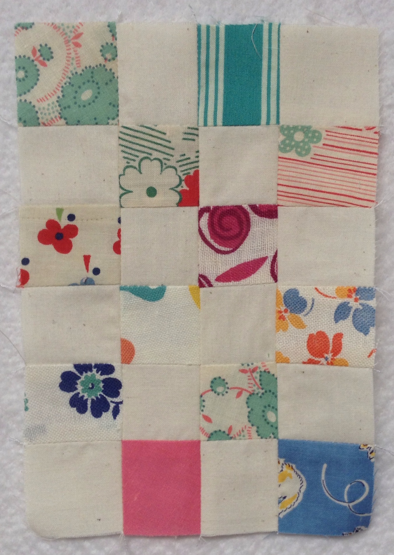 One thing I find very helpful when working with tiny pieces, is to starch the scraps well before cutting. Some of these vintage bits are loosely woven fabric and the starch really helps it to behave.