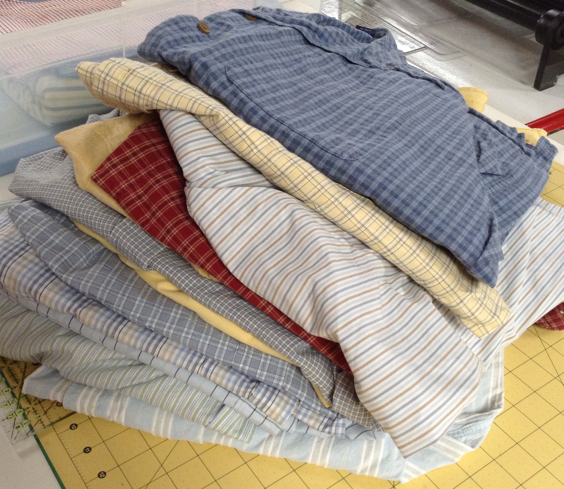 I also have an idea for another shirting quilt. I have added a few of my husbands shirts to my stash so I need to “debone” them as Bonnie Hunter would call it. She has a great video on YouTube showing how she does it. Check it out here. I thought my method was good until I saw her do it! Her method is way easier! Good thing, I have a pile to do before I get to the fun stuff.
