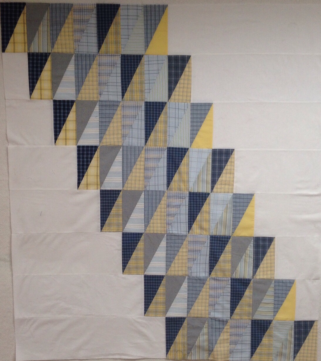 If you think this top looks a little wonky, you would be correct. Piecing these long skinny triangles isn’t easy and when doing it with a wide variety of men’s dress shirt fabrics, it is even harder. I could have left out those poly cottons and stretchy bits but they were colors/patterns I wanted to include so I am willing to live with some cut off points and mismatched seams. Life is too short to worry about those things all the time. I can’t wait to get this one on the frame.