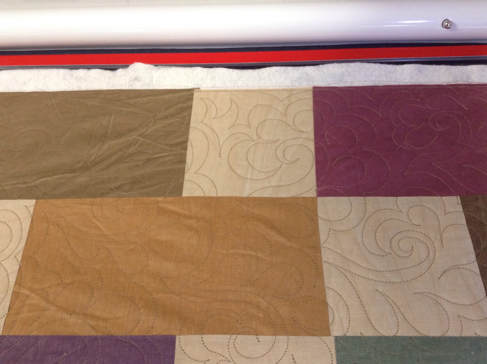 It is difficult to see in the picture above but I am quilting freehand swirls with feathers. I am using Omni thread in Maple on the top and Premosoft from Glide in the bottom. I had to move up to a size 18 needle to avoid thread shred.