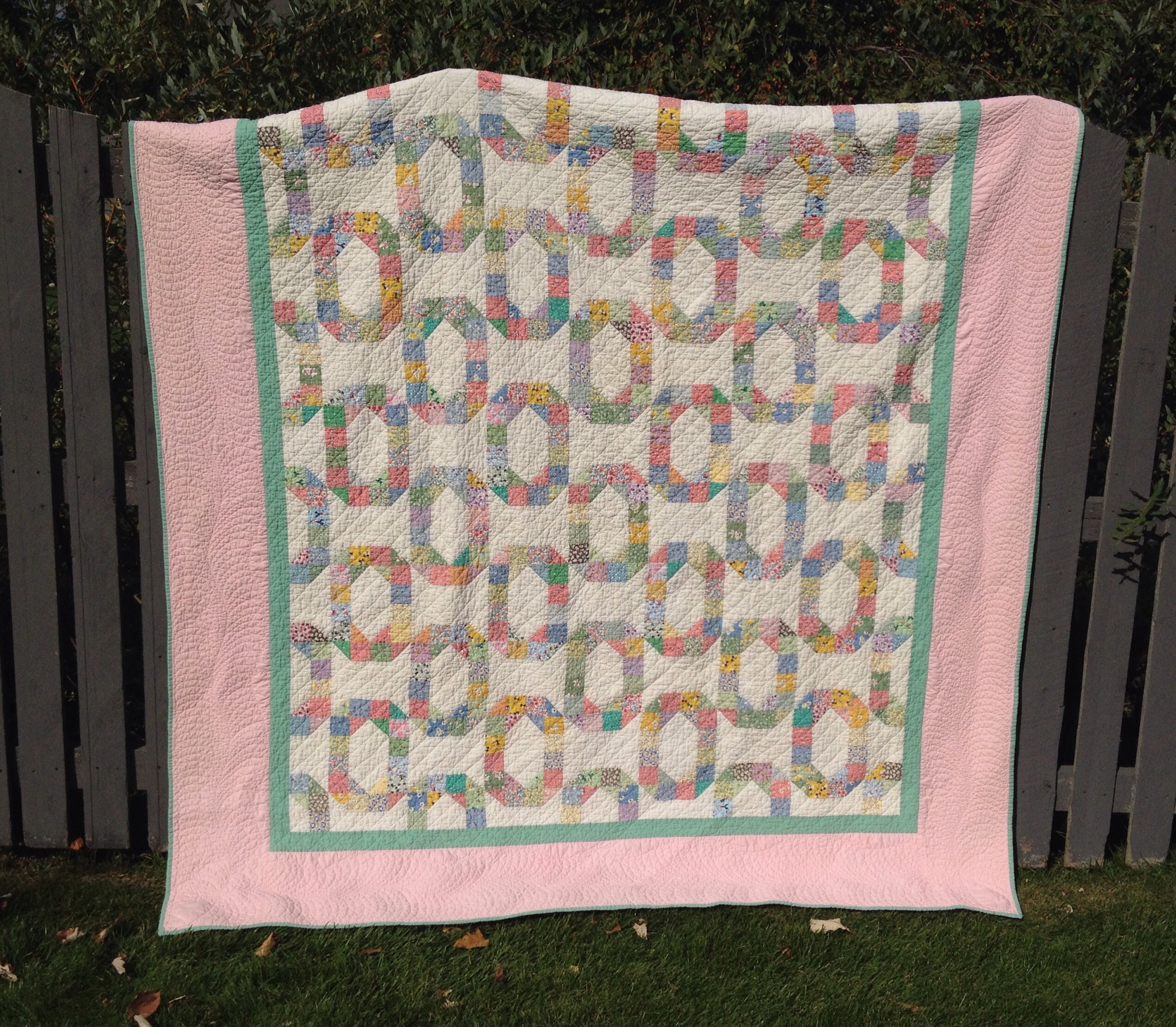 This quilt lives on my bed most of the time in the spring and summer. I just washed it and will be putting it away for a while. The original block pattern is called Memory Chain but I simplified it slightly. The green and pink fabrics are vintage percales and the prints are repro 30s. I quilted it on my 1955 Singer Model 201. This is definitely in the top 5 of my favorite quilts I have ever made.