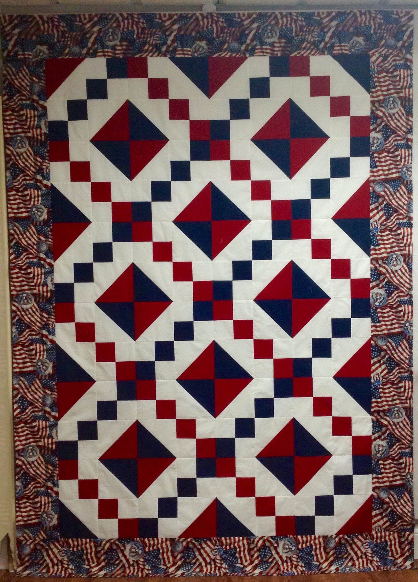 The quilt top finishes at 60″ x 82″ . You will need approximately 1 yard of red, 1 yard of blue, and two yards of white. You will also need 2 1/8 yards of border fabric. You will have enough border fabric leftover to use for your binding if you like. Otherwise you will also need 2/3 yard of binding fabric.