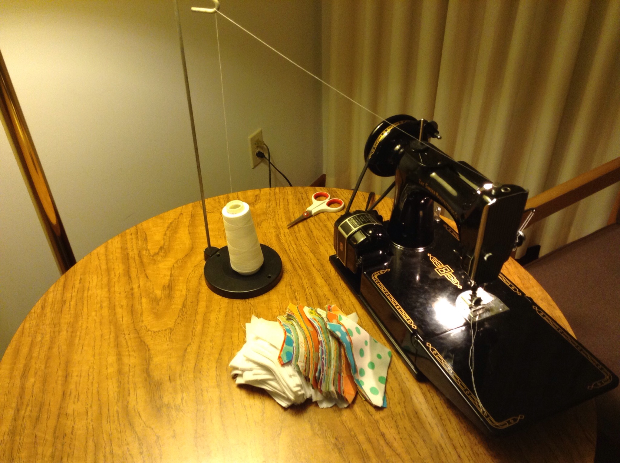 Thursday night I spent the night in a hotel on the way home to visit family. I brought along my featherweight and set up shop!