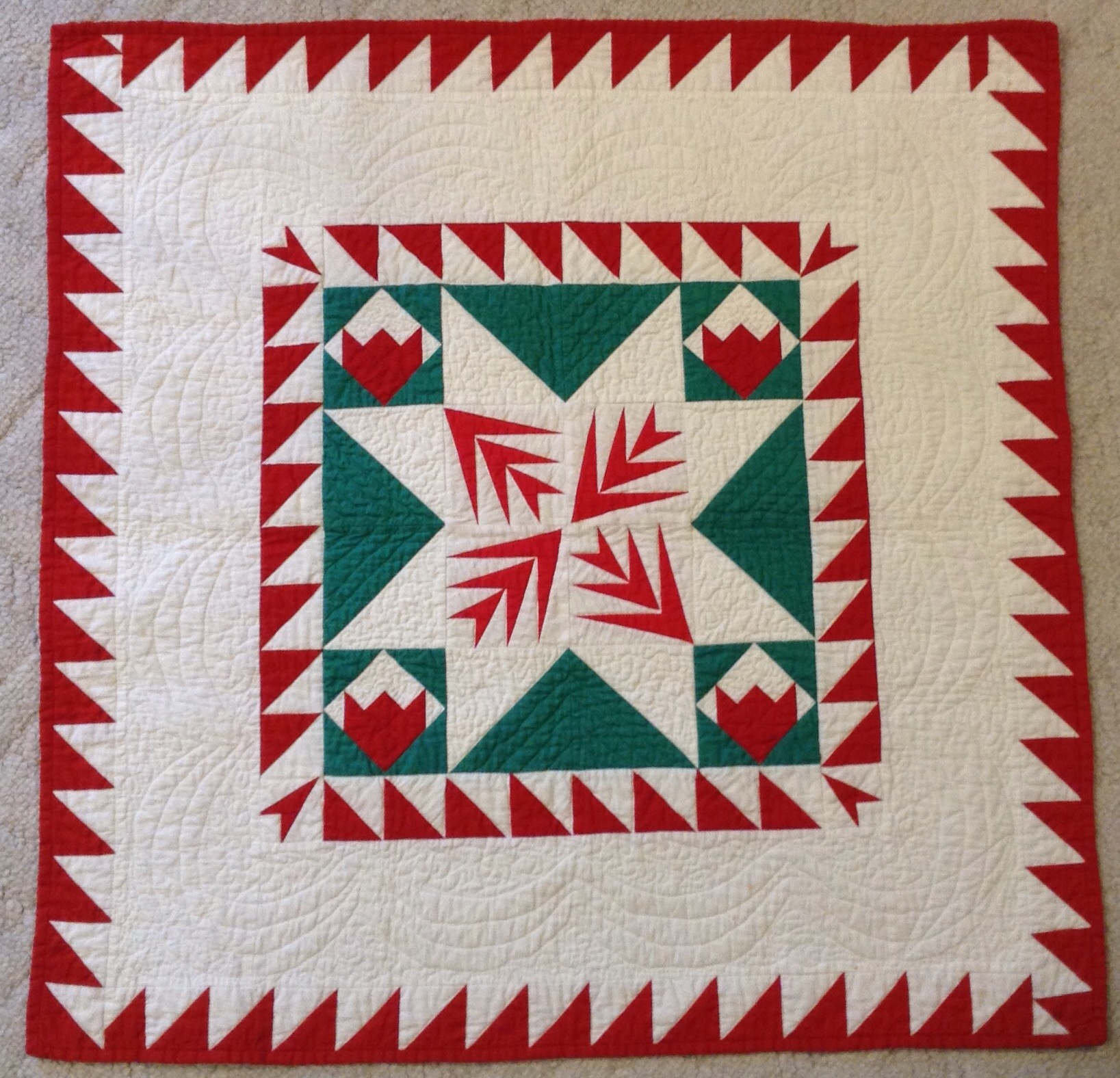 This was a Round Robin project done in my local guild. This is probably 20 years old. It is my very first free motion quilting work. I think I used one of my Singer 301s for this.