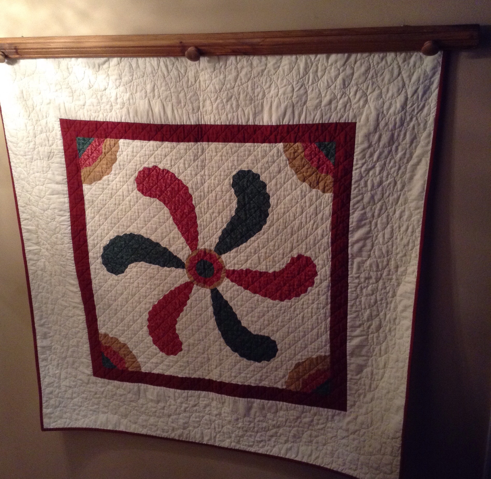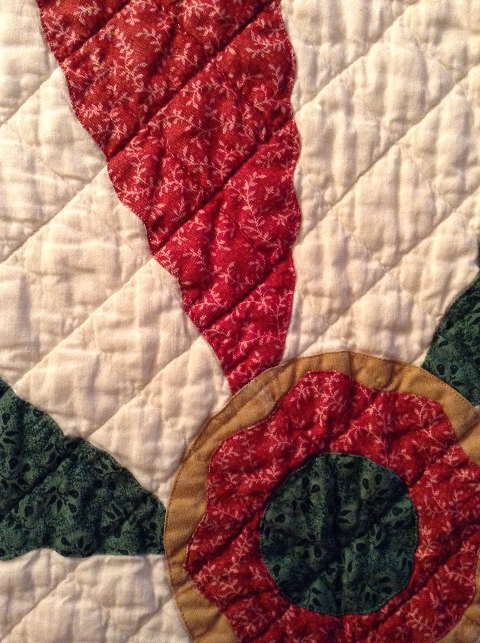 Sorry for the skewed picture. It is hanging in my foyer and I couldn’t get a straight on shot. I made this about 15 years ago. It is all done by machine on my trusty 1955 Singer 201. I cut freezer paper templates for the applique and used a glue stick to turn the edges under. Then I top stitched the pieces down using invisible thread. Here are a couple detail shots.