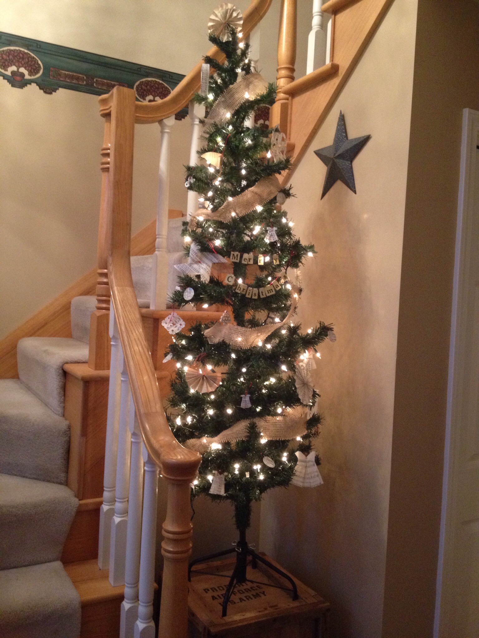 Love the little tree by the stairs! We have our tree up too – it has become a Thanksgiving evening tradition since that is the time all of us are home to do it. Love your quilting on the QOV. The stocking is very cute.