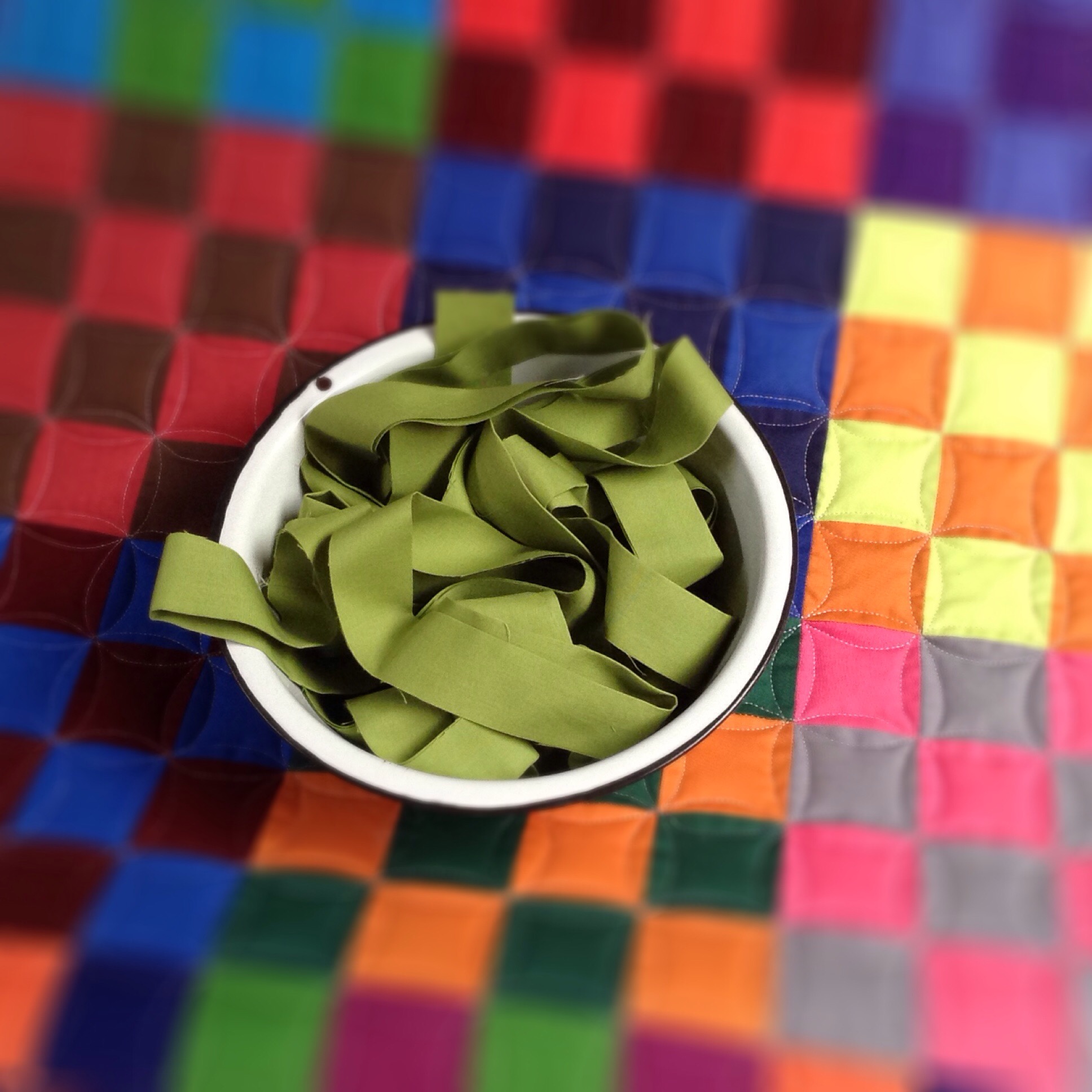 I loaded this quilt in the frame before the kids arrived and have been quilting in odd moments here and there. Last night, I took it off the frame and trimmed. Before work this morning, I made the binding. I got the machine sewing done during Baby L’s nap.