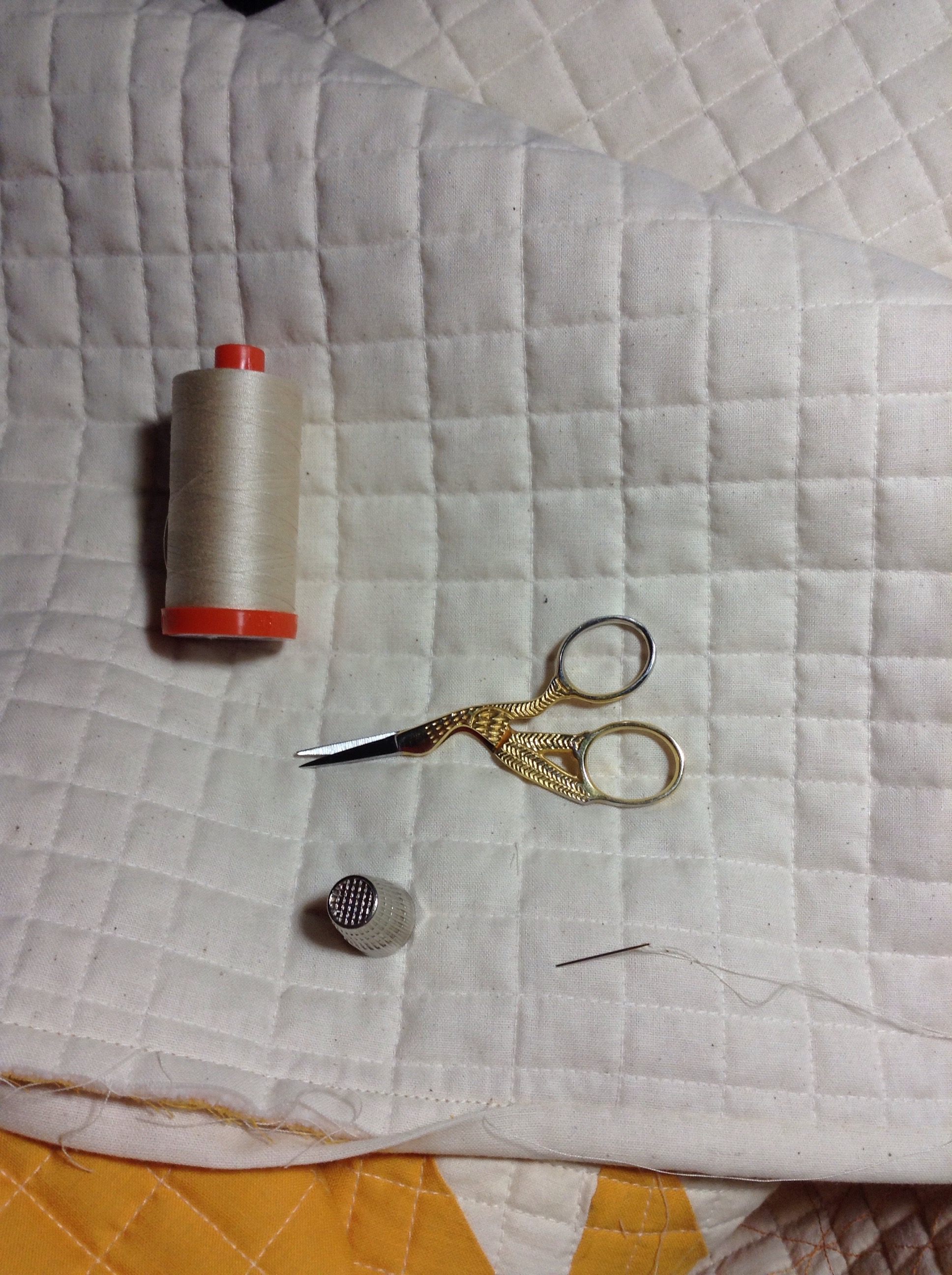 I got the binding on the cheddar quilt yesterday and started the handwork..
