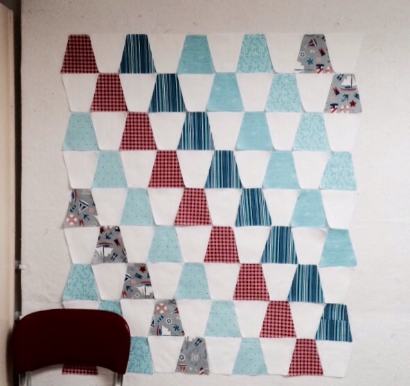 I had to do a bit of unsewing to add these to the ends of the rows I had already sewn together. but this is what it looked like after adding the half tumblers and sewing the rows.