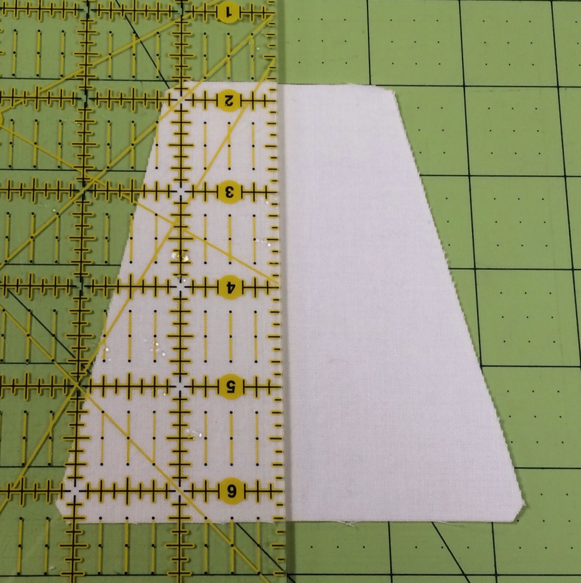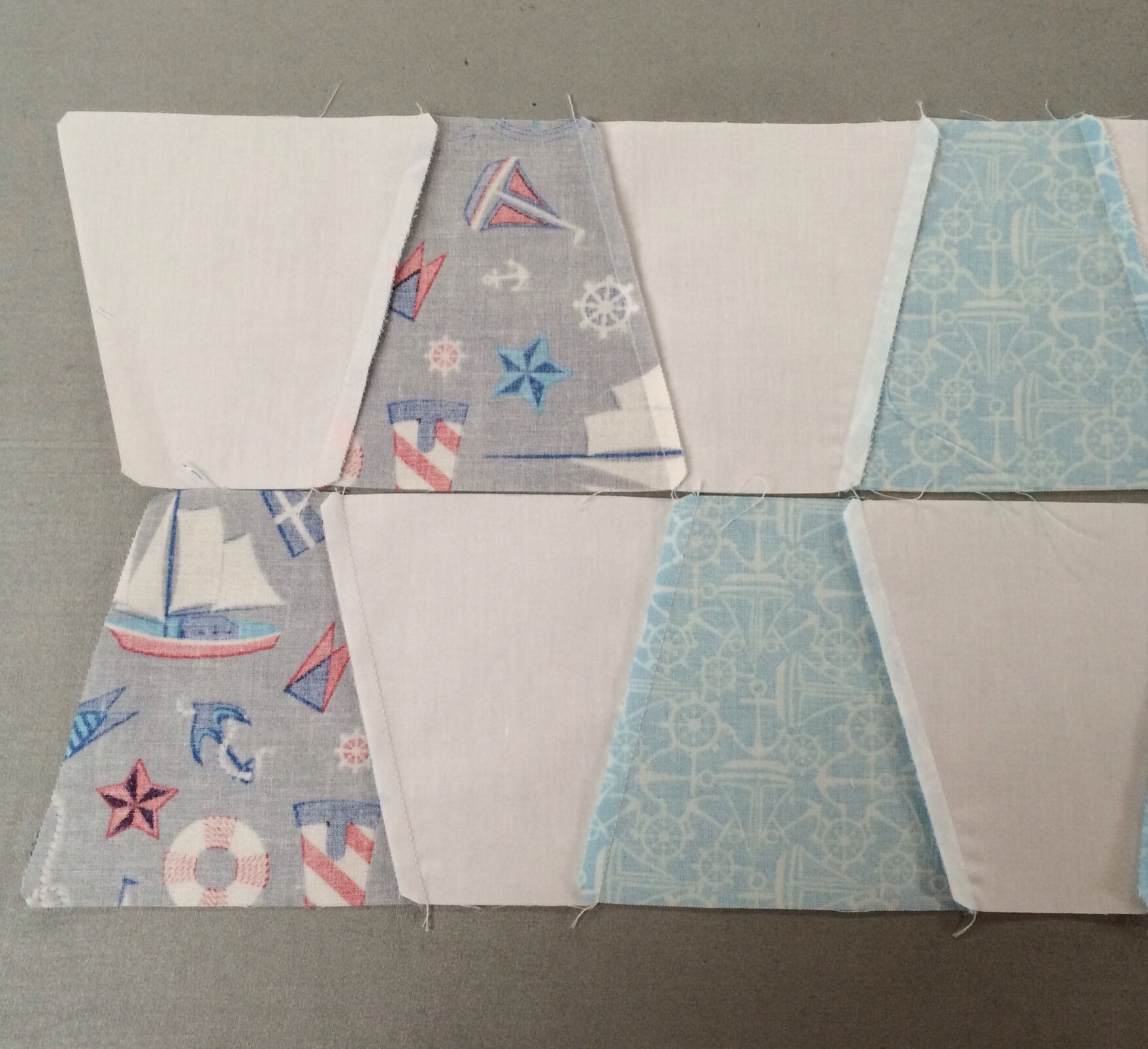 I decided that I didn’t want to cut my print tumblers in order to straighten the edge of my quilt top. So I took some of the leftover white tumblers and cut them in half like this.