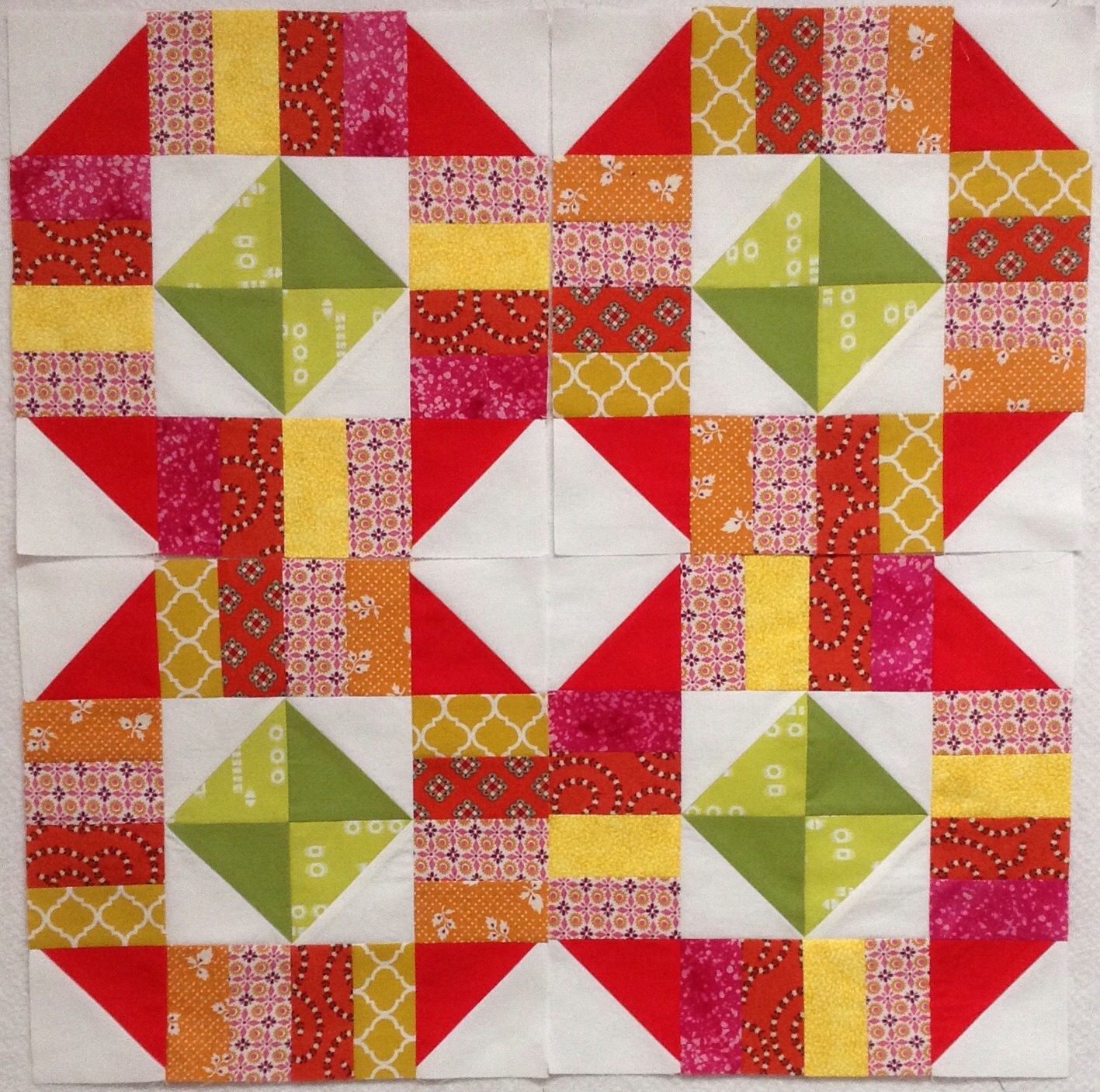 I really like your swap blocks – gorgeous happy colours – what is the name of the block please? do You have a pattern you can share? I would like to make some too. Your log cabins blocks are getting high – do you starch them? They look very flat. Love the fabrics you have used in those.