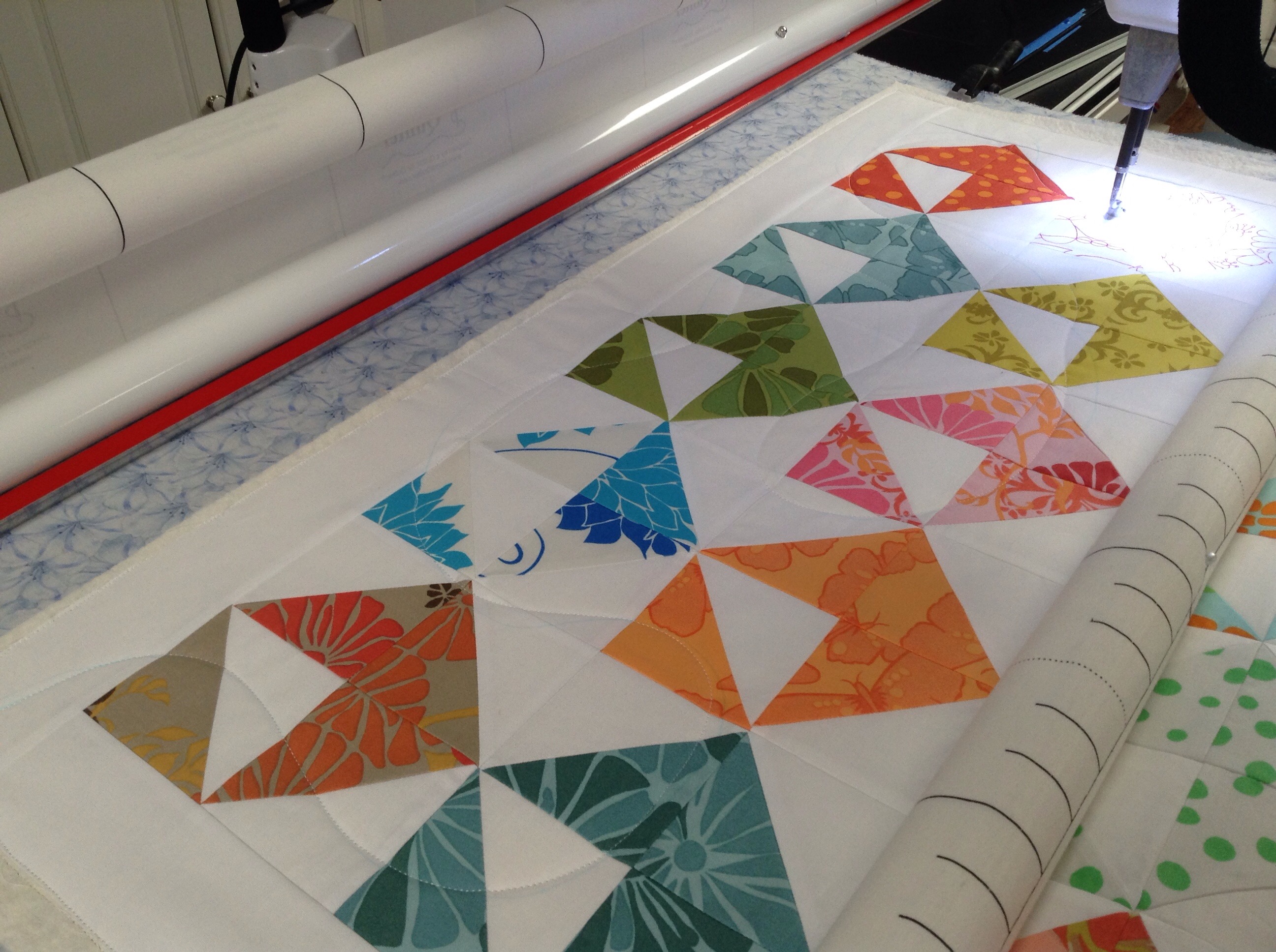 Another great quilt Katy. Nice to find the backing and binding in your stash. Looking forward to seeing it off the frame and with binding attached – no pressure!