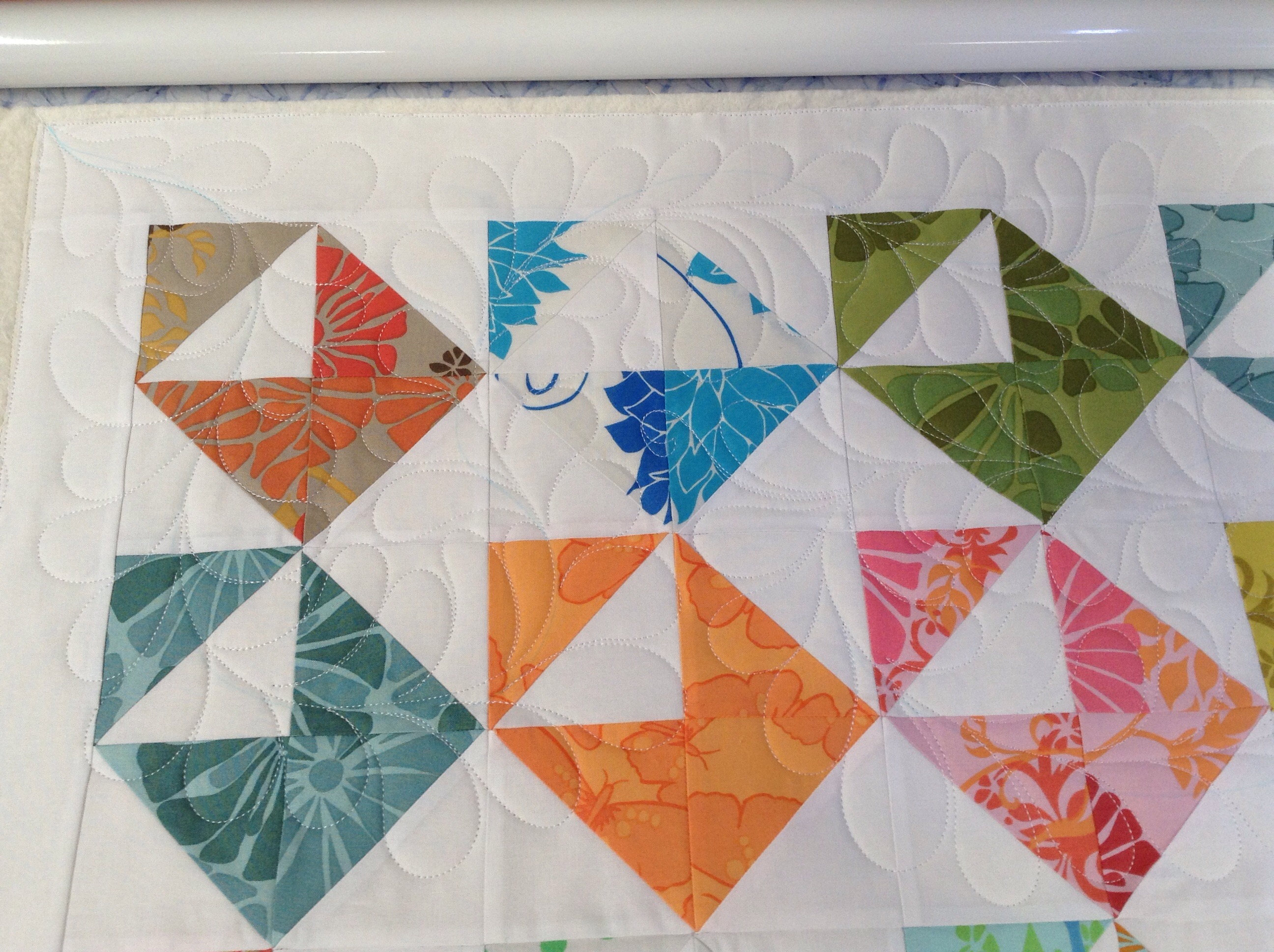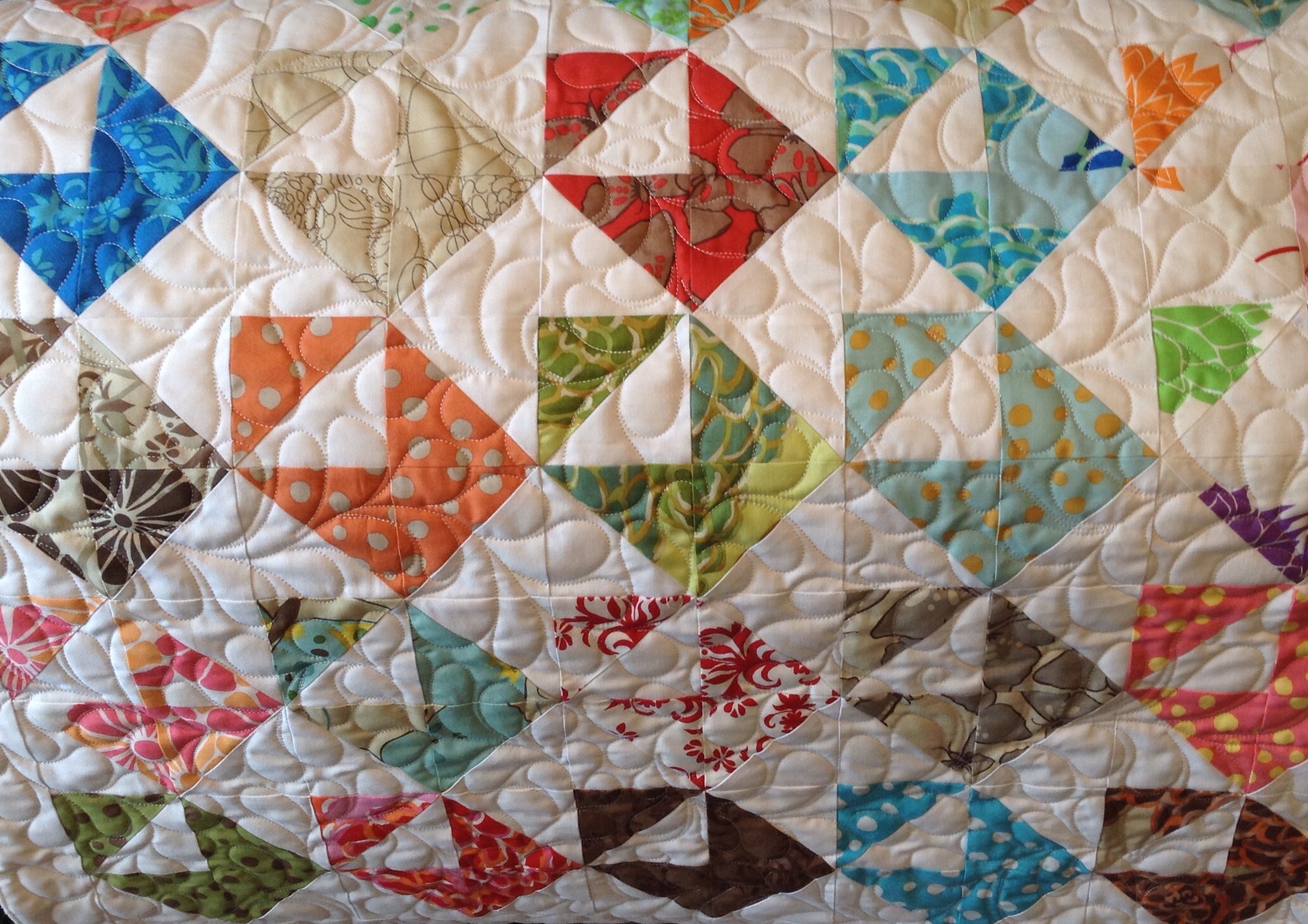 What a surprising HST layout! I thought I’d seen them all, but i was wrong. This is such fun; placed like this the blocks look like open envelopes. Beautiful feathers too; you’re lucky to have enough space for a frame.