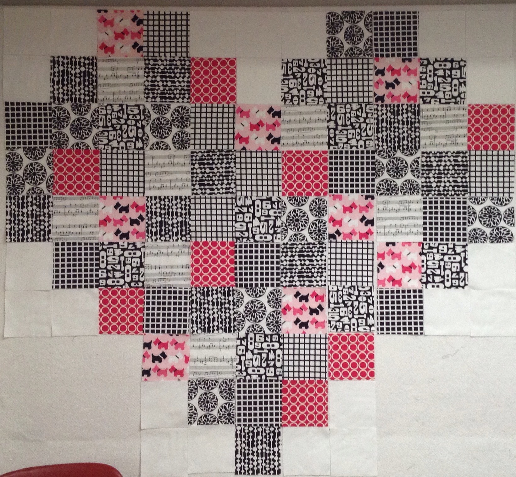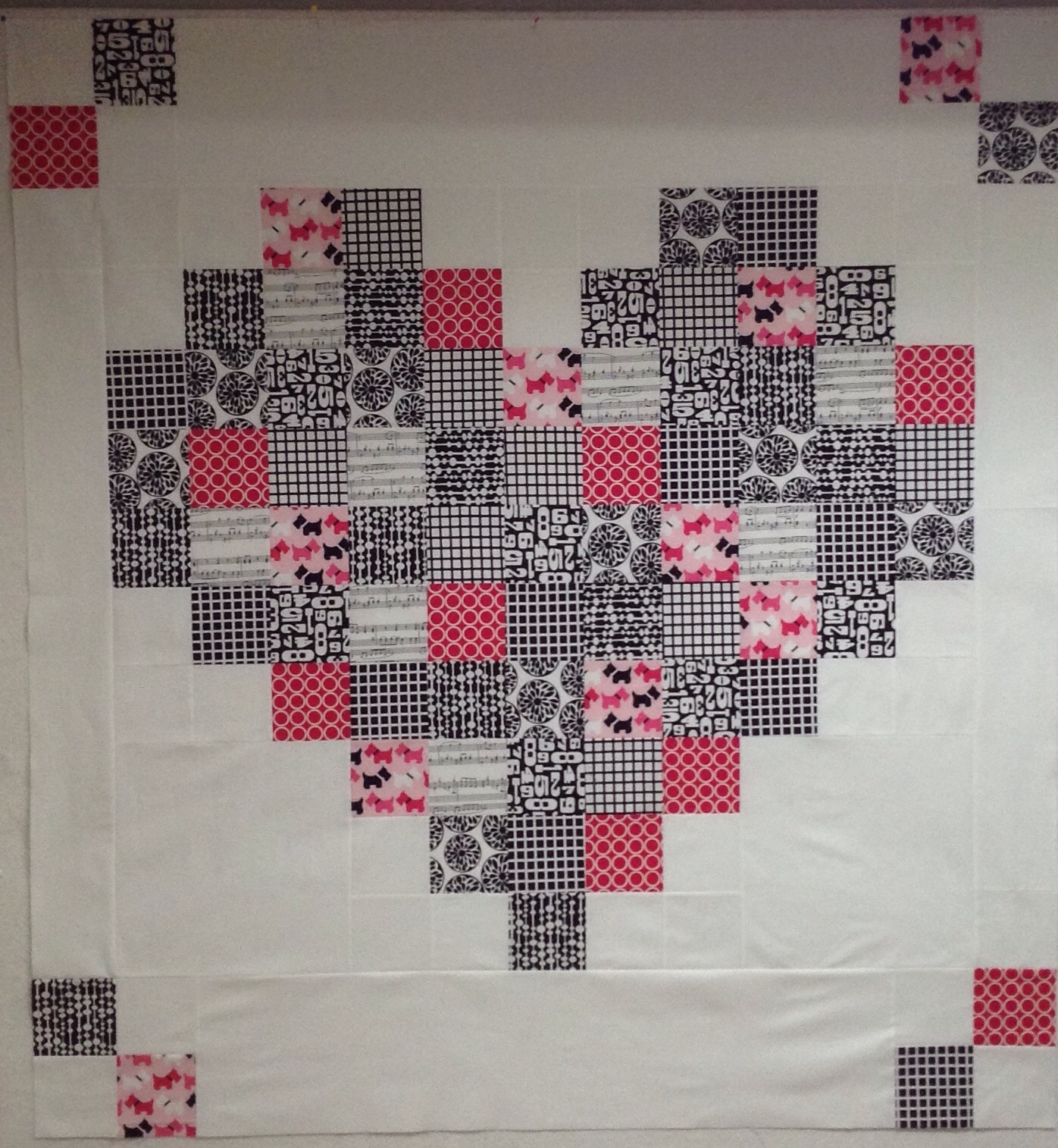 I used a free pattern from Robert Kauffman, found here ,for the heart. I wanted to make this bigger so I added white orders and 4 patches.