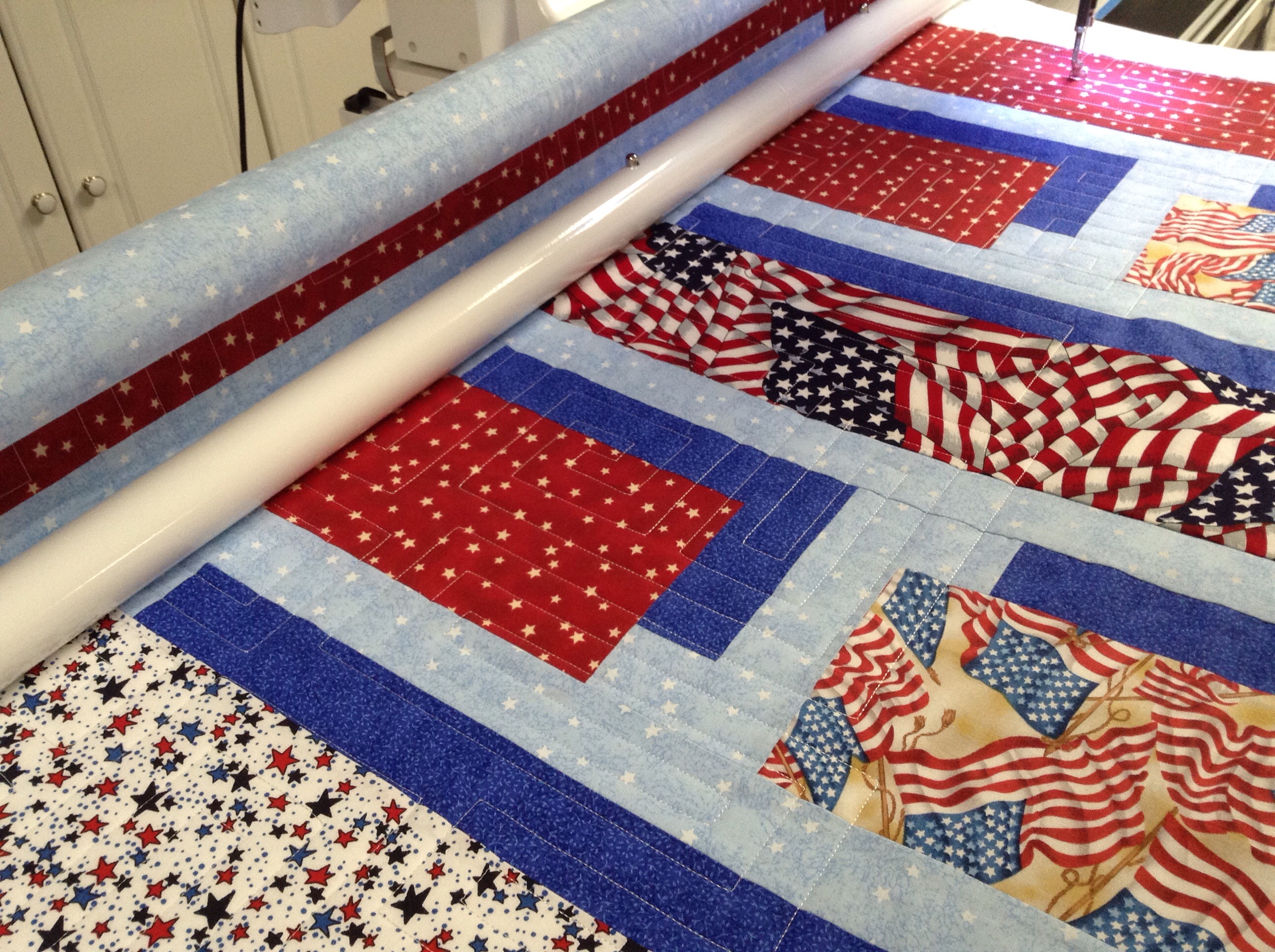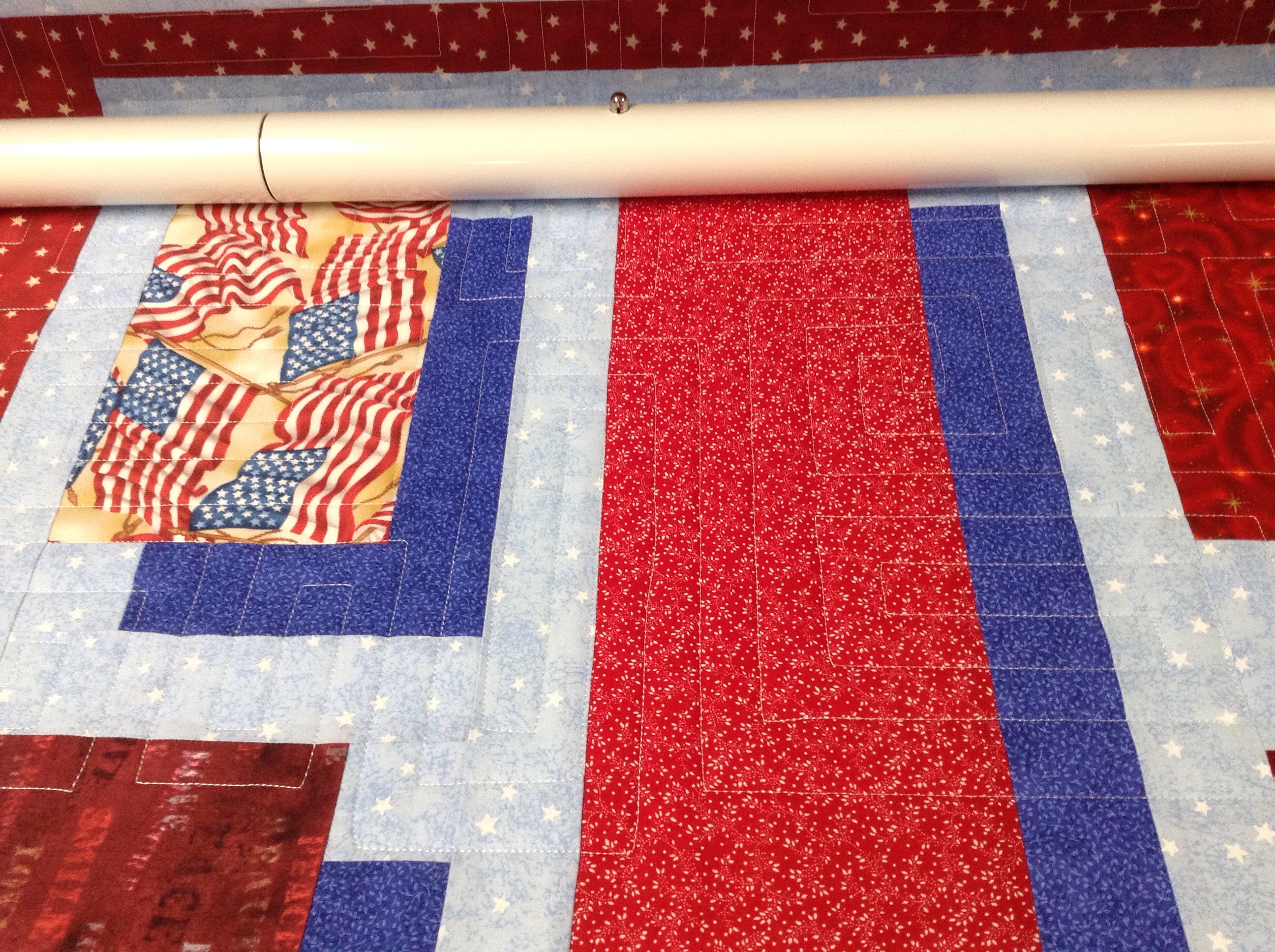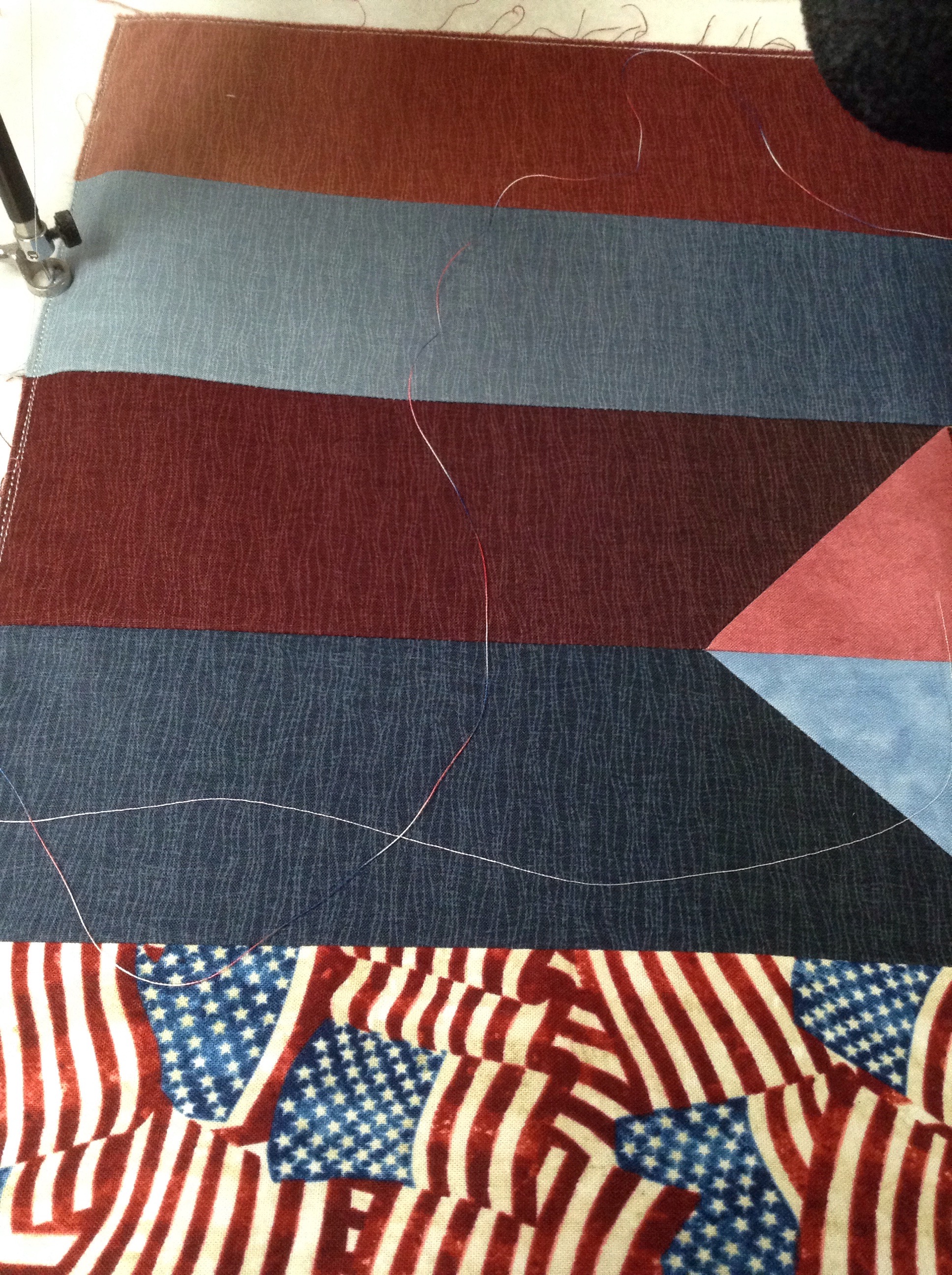 I have figured out how to quilt the printed flag strips but I am still undecided about the pieced strips. It is my goal to enhance the piecing of each top, not over power it. I considered using rulers to quilt a simple grid here but the grids/diamonds from strip to strip won’t line up. Perhaps the answer will come to me while at work this afternoon.