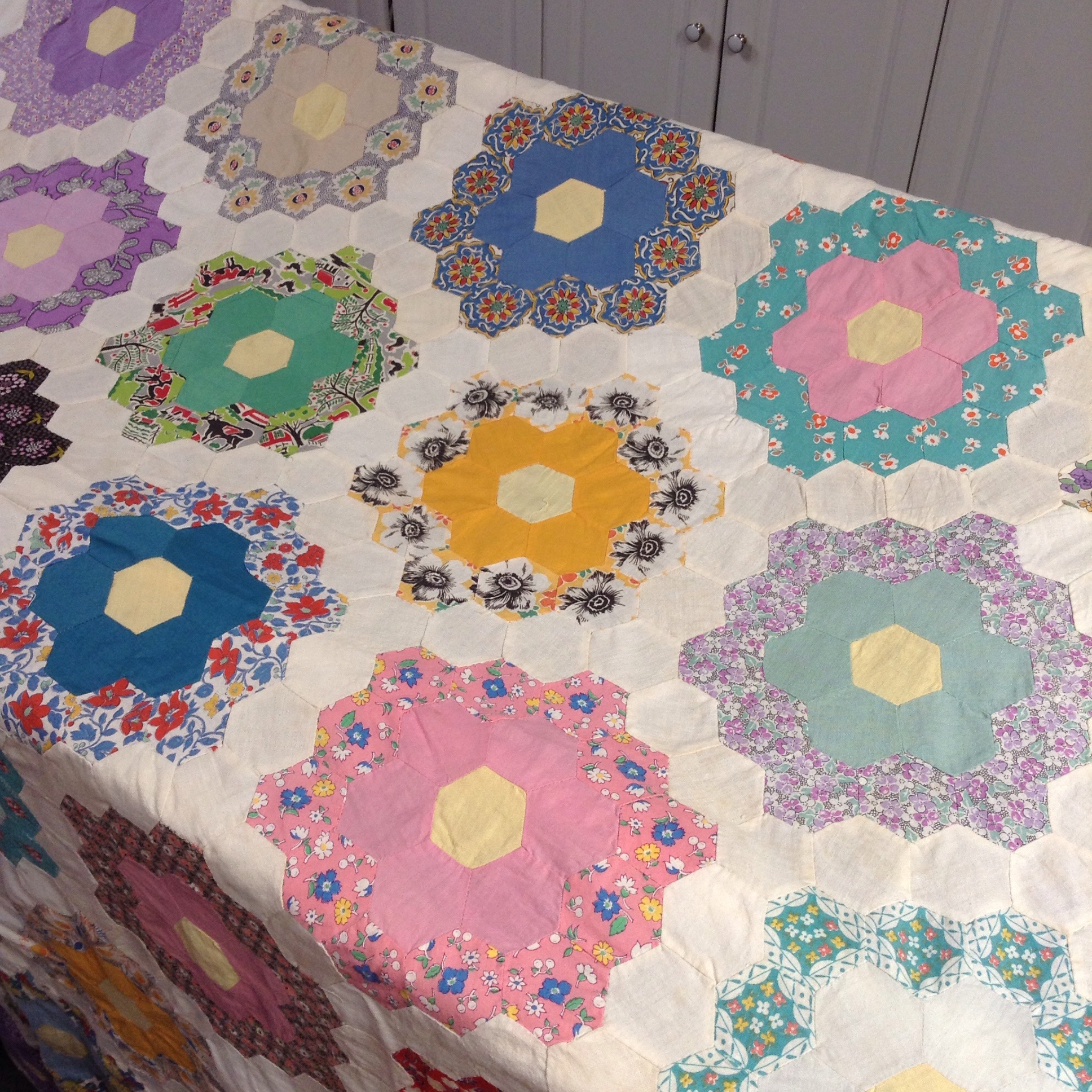 Waiting with bated breath to see how you quilt the Grandmother’s Flower Garden. I finished a top, but don’t know what to do for the quilting. Since it was English paper pieced by hand, I’m wondering if I should even machine quilt it. Perhaps hand Big Stitch quilting. Any ideas?