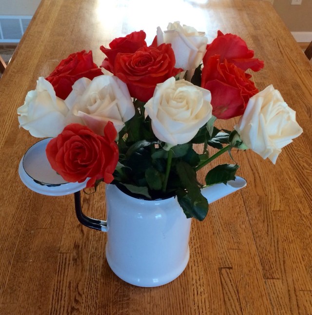 And I will leave you with this picture of the lovely roses that Mr. Wonderful bought for me in the enamel coffee pot that Daughter #1 gave me.