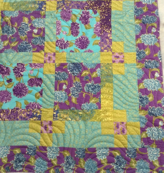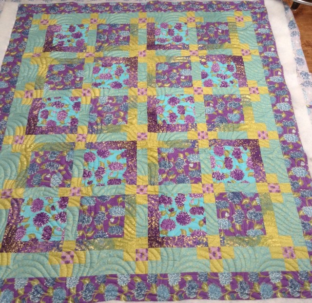 I picked up a few tops to quilt from our guild’s Comfort Quilts group yesterday. They make quilts for the women’s shelter. Quilting tops made by others really moves me out of my comfort zone! This top is lovely but not something I would have ever made myself. I used the Fern Gully panto on it and some high loft poly batting (which I still hate).