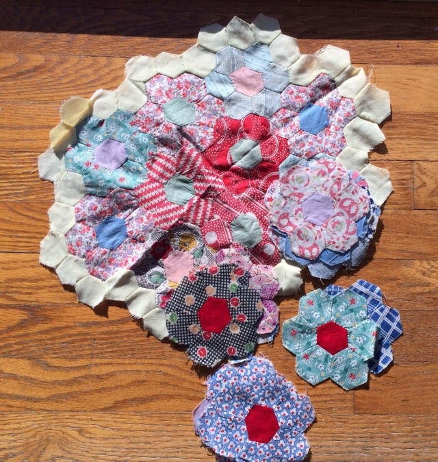 Yesterdat, hubby took me to an estate sale and antique show. It was cool but sunny, and it felt good to get out and bum around a bit! At the estate sale, I found some vintage quilt pieces and a bit of vintage fabric. Love these little Hexie bits.