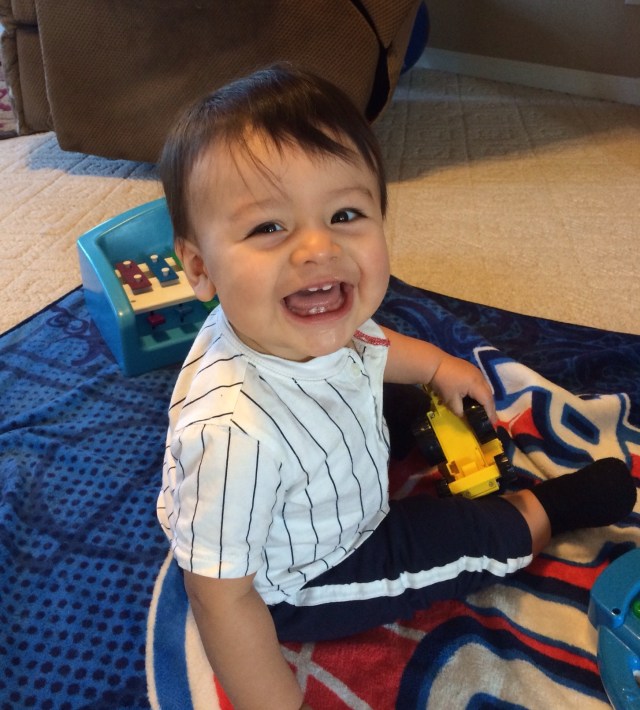 Awwwww what a little sweetie!! He looks so happy! Love your city sampler blocks.