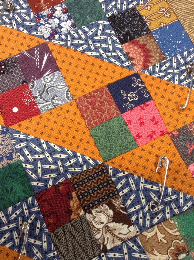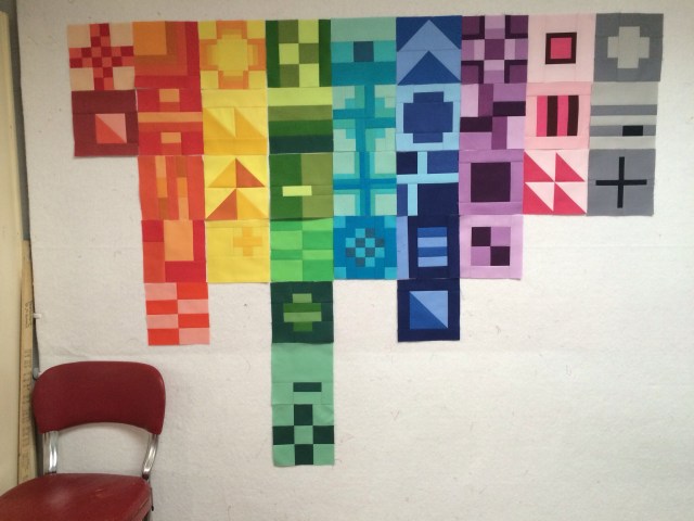 I like your color family layout–and I like the unevenness of the rows. If you get tired of doing all the blocks (not that you will, I’m sure), this would be a neat format, with the uneven negative space at the bottom. I also like the contrast between your modern looking quilt blocks and your antique-looking fabrics/quilt.