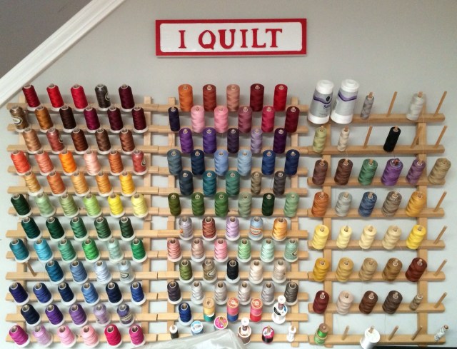 These thread racks hold my embroidery machine thread as well as cotton thread for piecing and domestic machine quilting.