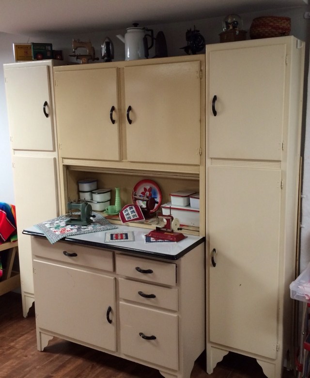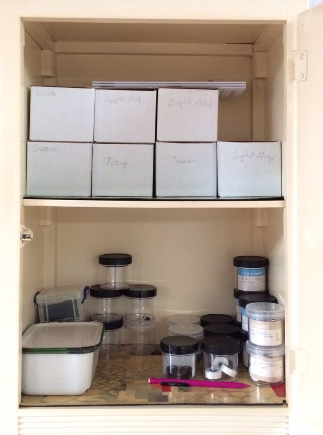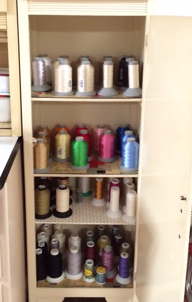 The storage in this cabinet is still a work in progress. I recently cleaned out one side cupboard to house my long arm quilting thread.