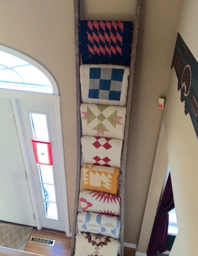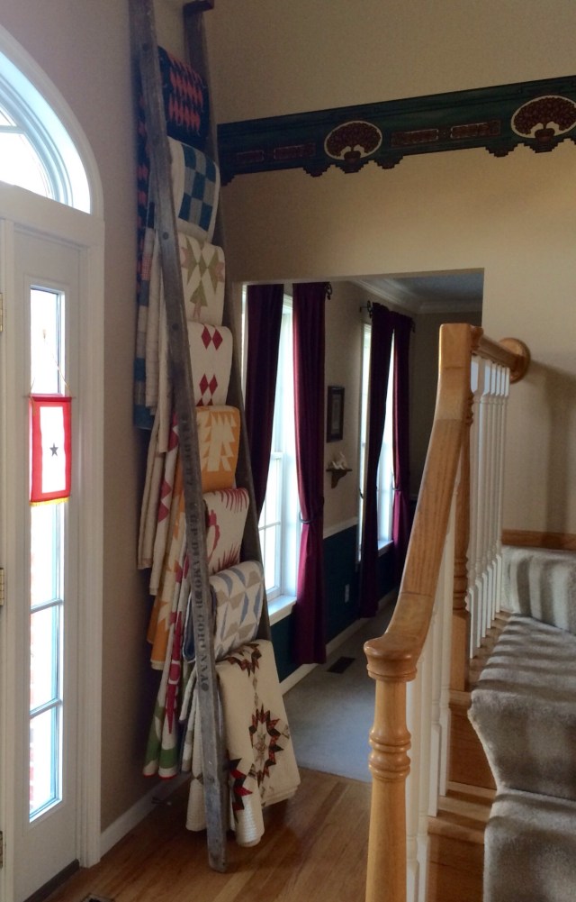 I spent time arranging my oldest quilts on my ladder yesterday. Our foyer is two stories tall and has the stairway in it. I was able to tilt the ten foot ladder towards the first landing to place the quilts in the top rungs. It is difficult to get good pictures in this tight space but here goes.