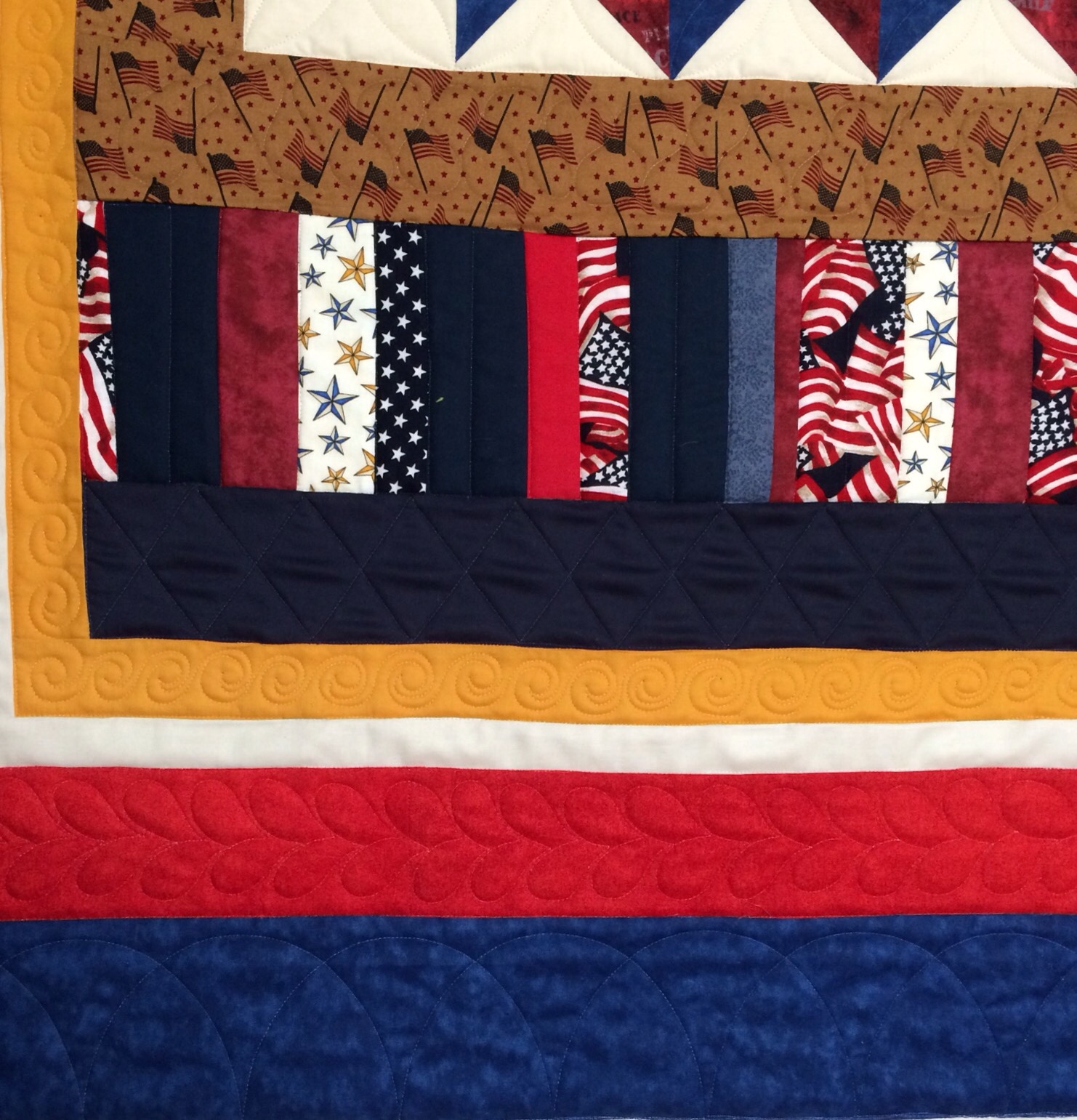 This one was custom quilted with ruler work, templates and freehand quilting. It took almost three times longer to quilt than the star quilt done with a pantograph but I think for a medallion quilt, it was the right way to go.