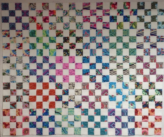 Decisions, decisions. Either way it will be a wonderful quilt. Have you thought of alternate ways to add to the size of the quilt? If you have any squares of the fabrics left you could do border of colored sq, white sq, colored sq and set it between two white borders… just saying! Of course, your sashing would actually make it much bigger than three borders.. or so I guess.