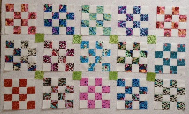 I wouldn’t use these green squares for cornerstones but they were cut the right size and handy to throw up on the design wall.