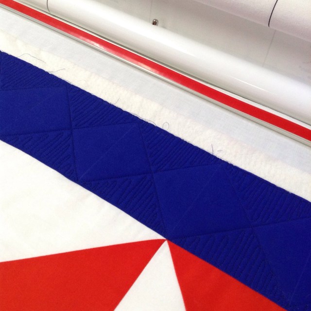 Last week I got it loaded into the frame and there it sat for a week. Sunday I finally started quilting and spent most of yesterday working on it. Long arm quilting is much faster than hand quilting but it is not exactly quick. I started with ruler work in the blue borders.