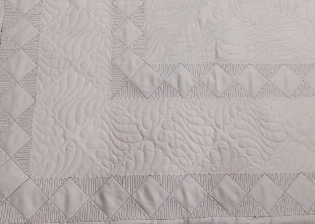 Another stunner! Those feathers are gorgeous and your background fill really does make those squares ‘pop’ 😉 While watching one of Angela Walters’ craftsy.com classes late last night, she referred to the tiny ‘back & forth’ quilting as ‘tooth pick quilting’…LOVE it! I’ve used it in several QOVs and not only is it very effective but, it’s Fast & FUN – two of my very favorite things to do in quilting. Looks like you are doing the same, it definitely shows in your beautiful quilting!