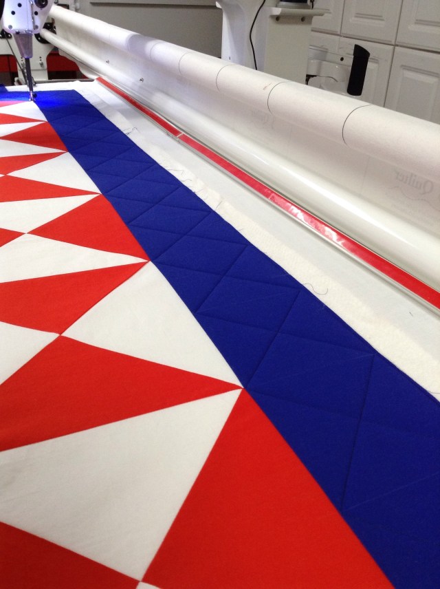 Last week I got it loaded into the frame and there it sat for a week. Sunday I finally started quilting and spent most of yesterday working on it. Long arm quilting is much faster than hand quilting but it is not exactly quick. I started with ruler work in the blue borders.