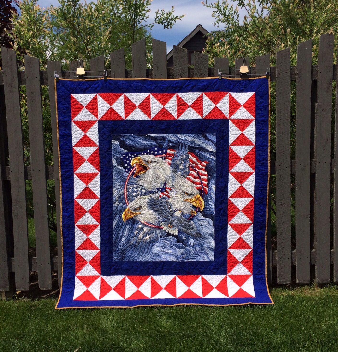 I didn’t realize until I started this post that I had the quilt hung on the fence crooked. Ugh! I used white for the back and that is the only thing I am not totally happy with.