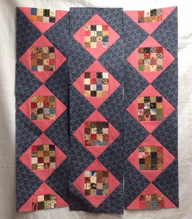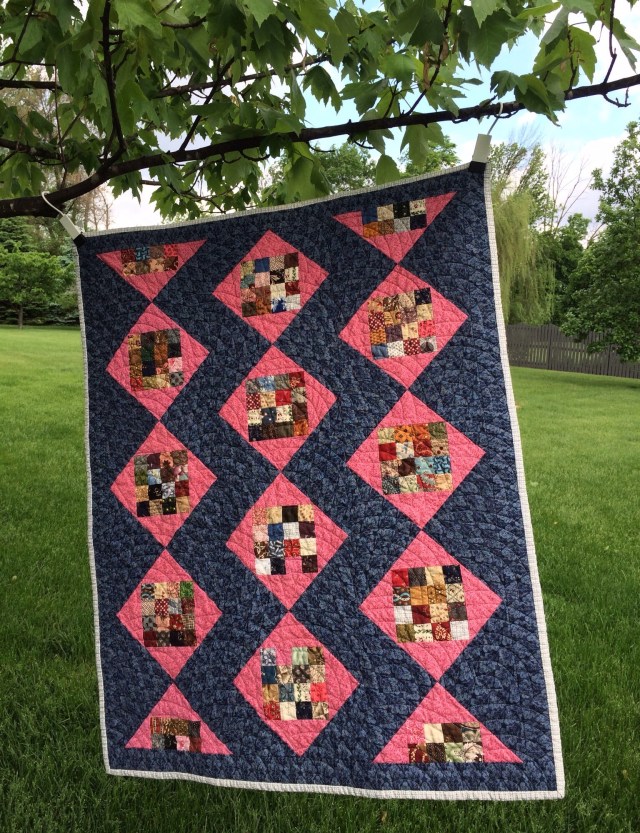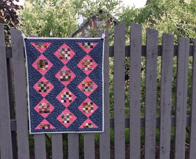 This looks so great Katy! Love that dark background with the blocks set on point! The backing fabric is perfect too. Wonderful quilting! Ikea clips – what a great idea!