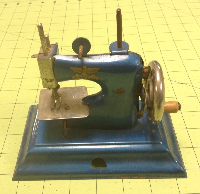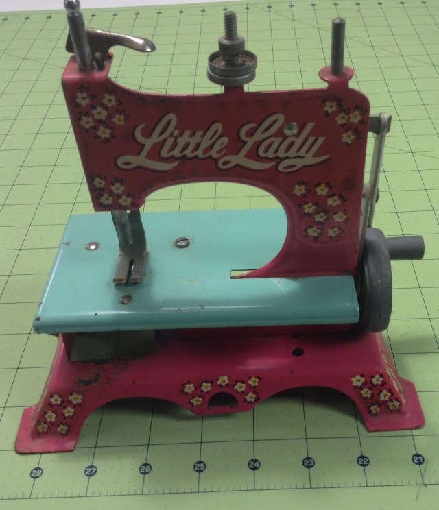 The little machines are precious! I will keep my eye out for some of those enamel ware boxes with lids–they look like great storage for sewing goodies.
