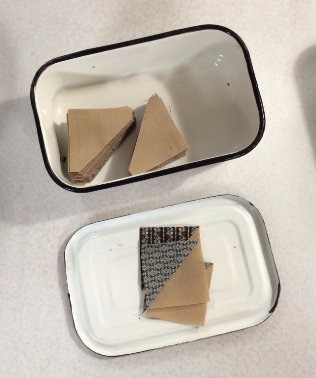 I started with a bundle of 8 fat quarters and added the background fabric. You may remember that I had just enough left to cut out these HSTs.