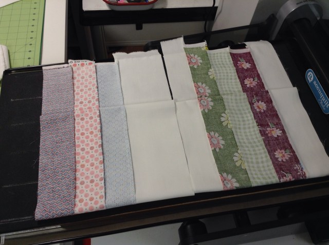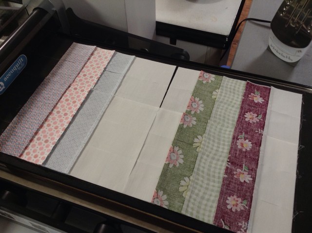 After I make my strip sets, I subcut them with my strip cutting die. In this case, the original print strips were cut at 2 1/2 inches wide. So I lay them out on my 2 1/2 inch strip cutting die like this: